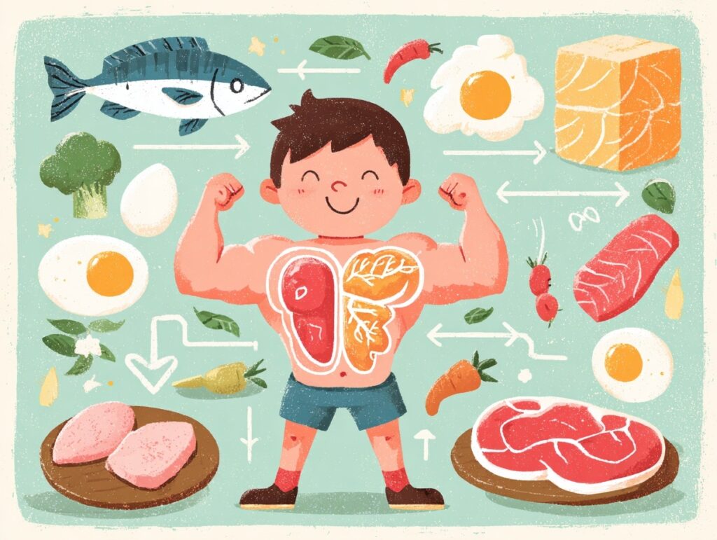 肉、魚、卵、大豆製品など。筋肉や臓器の成長に欠かせません。