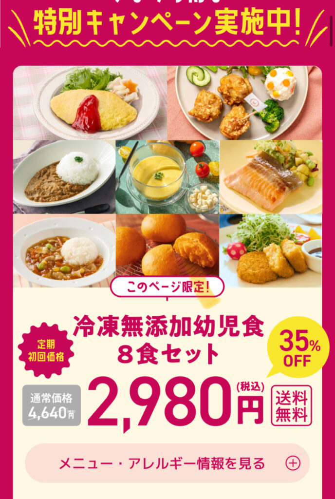 種類 | 1歳6ヶ月〜6歳向け、主菜・副菜など多カテゴリ展開(40種以上) |