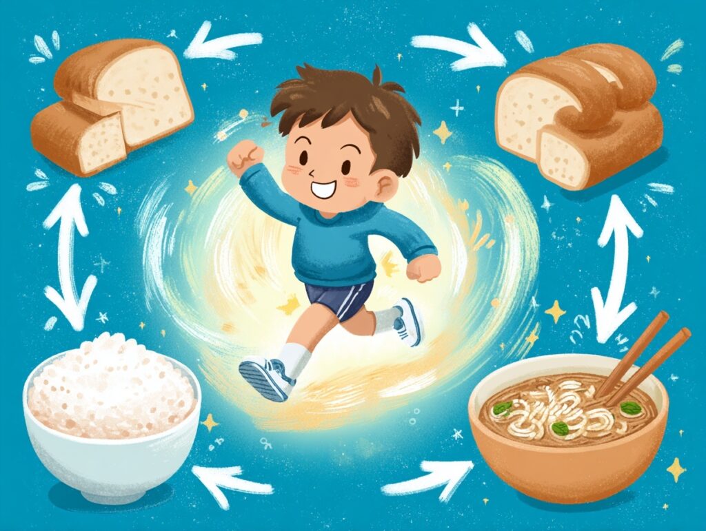 ごはん、パン、うどん、じゃがいもなどは体を動かすエネルギーになります。